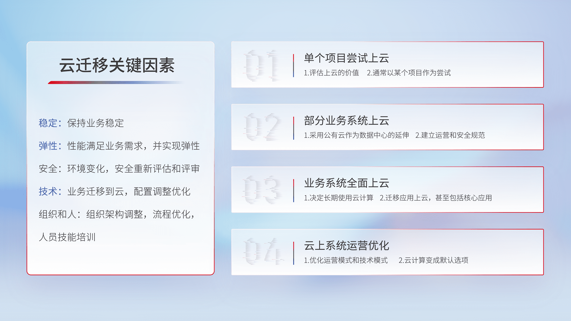 结合实际业务,,,,从规划设计、、云平台选型、、、云原生改造、、数据迁移、、集成交付,,,,迁移全过程为客户识别最佳上云路径,,,做好风险识别管理,,设计网络架构、、、、身份权限、、、、安全审计合规、、、、操作审计、、、日志审计、、监控告警策略、、多站点容灾设计等,,对云上基础设施进行整体规划,,,,提升IT治理水平,,,以满足弹性、、、、高可用、、、、高性能的需求。。