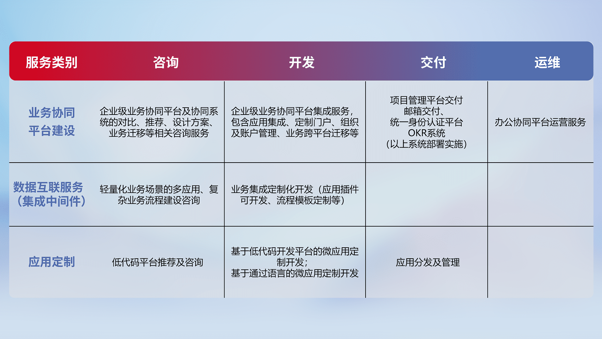 针对钉钉、、、企微、、、IDaas等平台级产品提供产品的规划、、、、方案、、、、交付、、、、定制化开发等服务,,,实现如统一协同办公、、、、智能客户服务、、、、混合会议管理、、、、智能数据查询、、等业务场景,,,,实现数字化转型。。。。